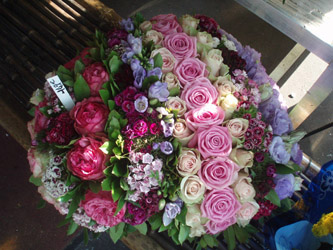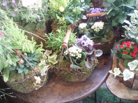 いる愛嬌のあるフラワーアレンジメントを見かけます。 モスがいっぱいのバスケットはアレンジメントではなく寄せ植えです。 |