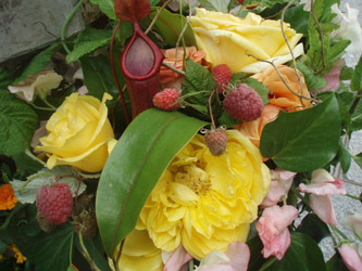黄色い芍薬は珍しいなぁとその可愛さに釘付けです。それから例の食虫植物が違和感なくアレンジの中に溶け込んで