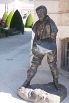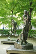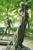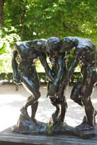 シンボルとなって、見下ろしています。 この情景が館内にあった絵画に描かれていた情景です。 館内にあったものよりもうひとまわり大きな「カレーの市民」。 ロダンの作る人間像はそのあまりにも緻密な作りに当時は審査員から「実際の人間から型を取ったのではないか」 と疑いをかけられたこともあるそうですが、こうして実際に作品を目にすると、その美しくのびやかな 人間の手足は実際よりも大きく誇張されていて、それがまたよりリアルに力強さをもって心にせまってきます。 |