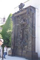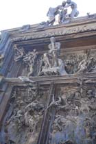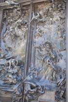 そしてロダンが最期まで製作し続けて未完に終わったという「地獄の門」。 館内のものはこじんまりとしたサイズでしたが、庭に置かれた作品は見上げてもてっぺんがよく見えないぐらいの 大きな大きな作品です。何度も試作を繰り返していたのですね。「地獄の門」の「考える人」よりも上にある 3人の姿は単独でガーデンにも別の単独の作品としてみることができます。。 これ程の大きい表現では、地獄の火の海の煮えたぎった壮絶な様子に見ている自分も飲み込まれそうなぐらい ひしひしと迫ってきます。 未完成に終わった作品といわれていますが、きっといつまで向かい続けても終りを知ることがない、 そんな作品に挑んでいたのだと思います。 ロダンの描きだす人間の肉体の美しさを表現しながらも、その表情はいつも物憂げでうなだれて、悲壮感に あふれています。笑顔の作品がひとつも見つけられません。 人間は業を背負っていて、全ての人間は地獄に落ちていくのかもしれない・・そして私もきっと地獄へ行くのだろう、と 何か言いようのない力に吸い寄せられてその傍に思わず歩み寄っていってしまいます。 神のようには生きられない、人間の苦しみです。 晴れ渡った空が悲しく見えてしまいます。 |